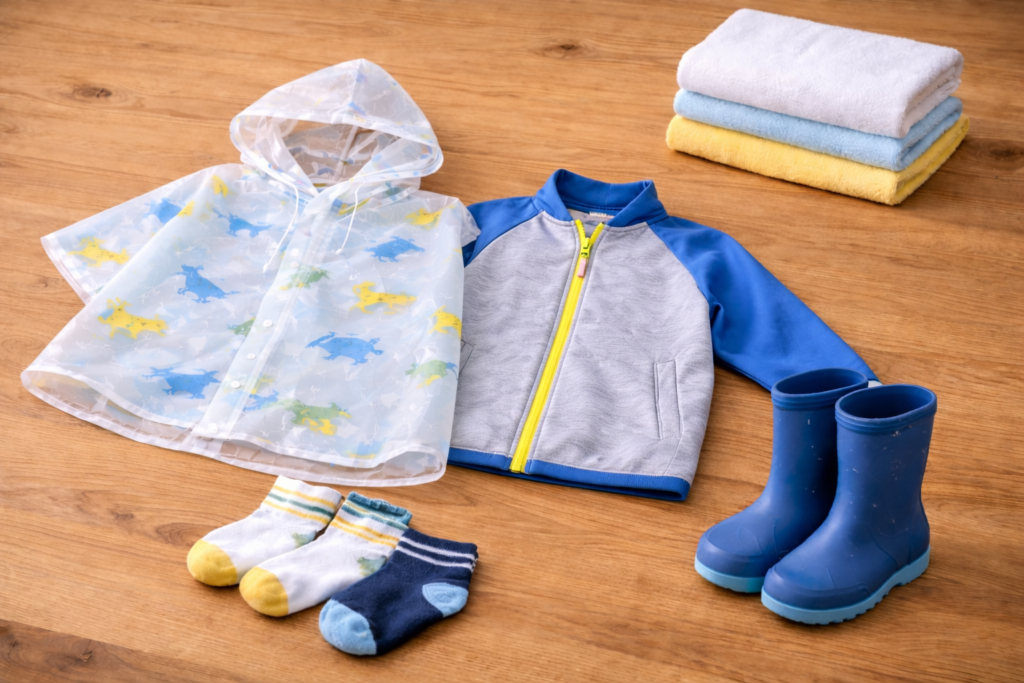 軽量の着替えを1セット持参しておくと、万が一濡れてしまっても対応できます。特に気温が低い日は、防寒用の羽織りものもあると安心です。